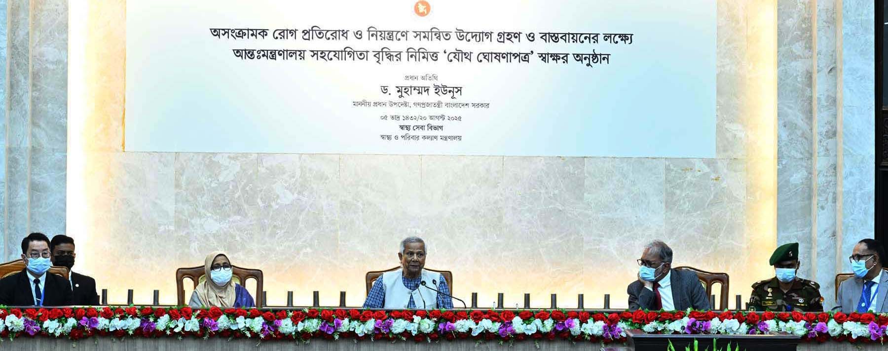 প্রধান উপদেষ্টা অধ্যাপক মুহাম্মদ ইউনূস অসংক্রামক রোগ প্রতিরোধে জনসচেতনতা ও নিয়ন্ত্রণ ব্যবস্থা গড়ে তোলার ওপর গুরুত্বারোপ করেছেন। অসংক্রামক রোগ প্রতিরোধ ও নিয়ন্ত্রণে সমন্বিত উদ্যোগ গ্রহণ এবং বাস্তবায়নের লক্ষ্যে প্রধান উপদেষ্টার কার্যালয়ে আয়োজিত এক অনুষ্ঠানে আন্তঃমন্ত্রণালয় সহযোগিতা বাড়াতে ‘যৌথ ঘোষণাপত্র’ স্বাক্ষরিত হয়।