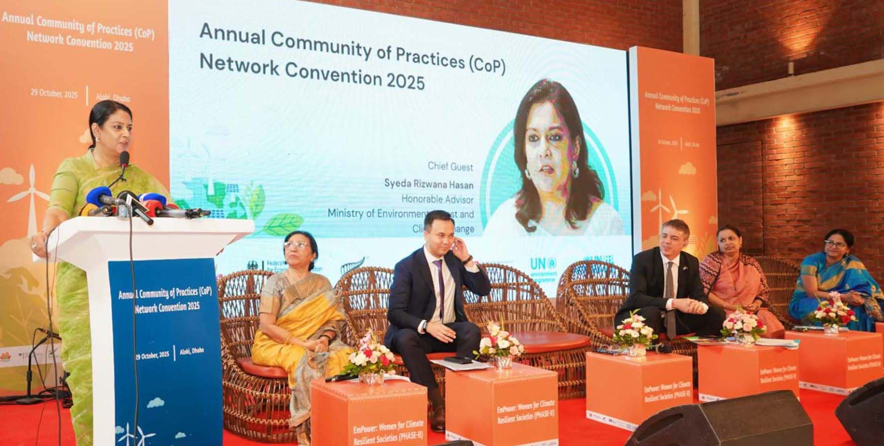 উপদেষ্টা আজ রাজধানীর আলোকিতে অনুষ্ঠিত ‘Annual Community of Practices (CoP) Network Convention 2025–EmPower: Women for Climate Resilient Societies (Phase-II)’ শীর্ষক অনুষ্ঠানে প্রধান অতিথির বক্তব্যে এসব কথা বলেন।